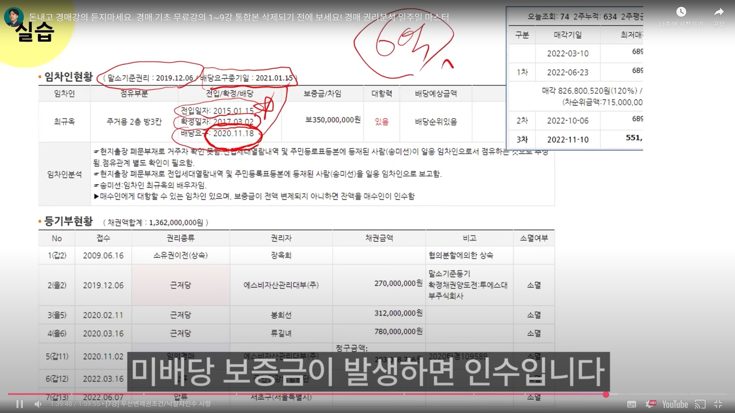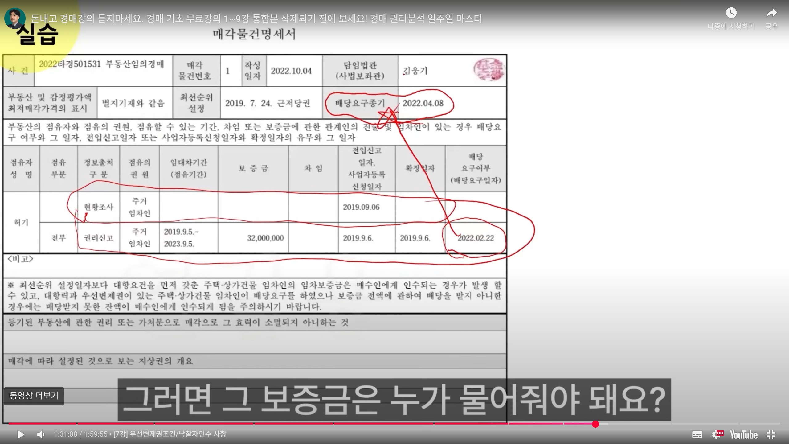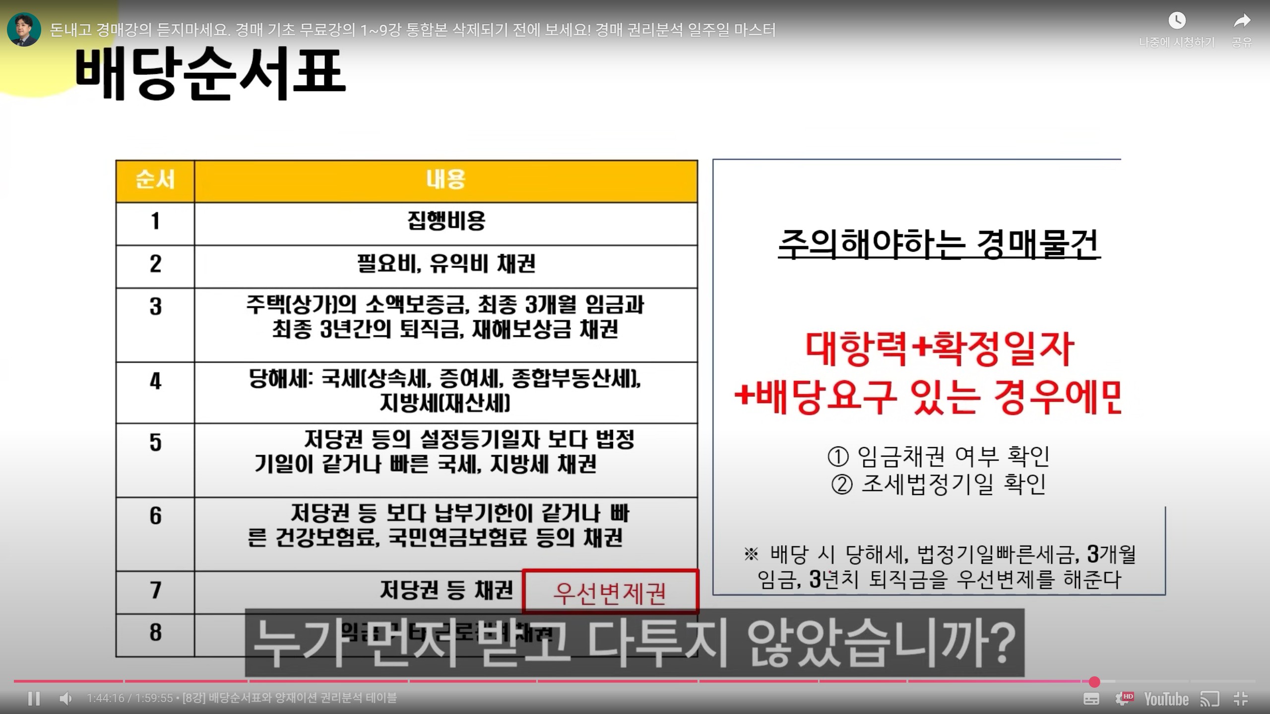 - 결국 순서는 세금 > 은행 > 우선변제권 임차인 > 일반 임차인 > 기타 채권자 > 집주인 이라고 기억하면 됨.